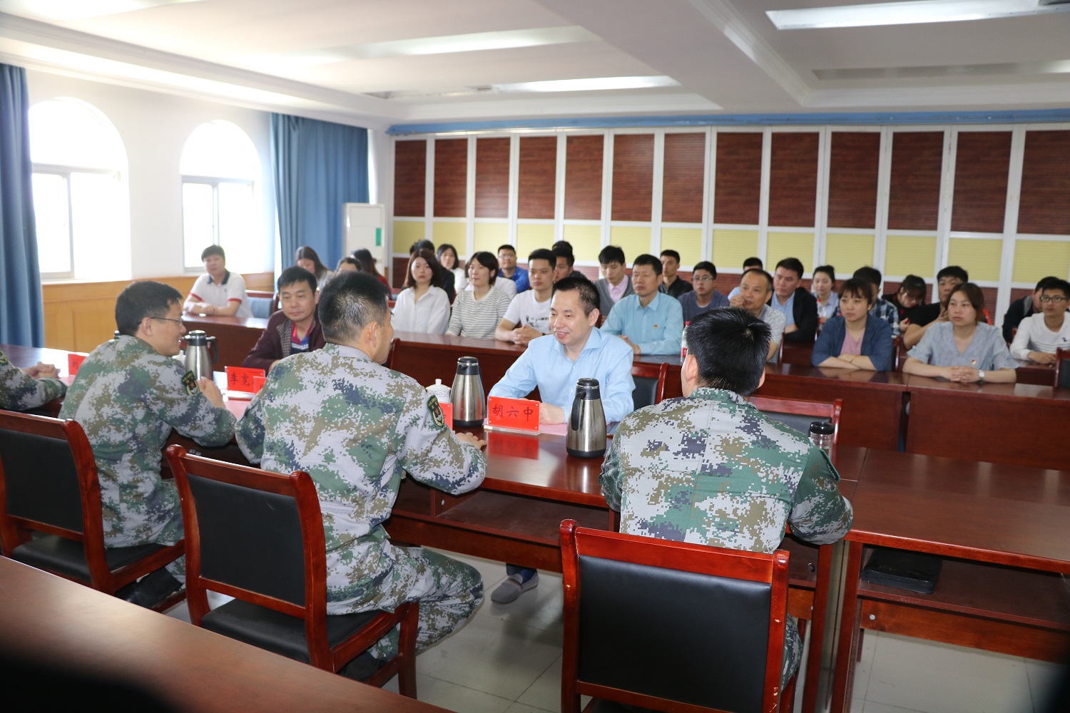 在軍地座談會上,安徽預(yù)備役師高炮團團長陳壽、政治處主任周玉兵、后裝處長劉春、司令部負責(zé)人凌德山出席會議,陳壽團長對安徽安裝公司團員青年的到來表示歡迎,并對高炮團的基本情況進行了簡要介紹。胡六中書記在座談會上對此次團員青年走進軍營學(xué)習(xí),與對方進行了交流,他說,團員青年正值價值觀的塑成期,此次走進軍營,親身感受軍人的信仰、信念、紀(jì)律、本領(lǐng)和血性更是作為國有企業(yè)職工持續(xù)點燃愛國熱情、責(zé)任擔(dān)當(dāng)?shù)碾y得機會!